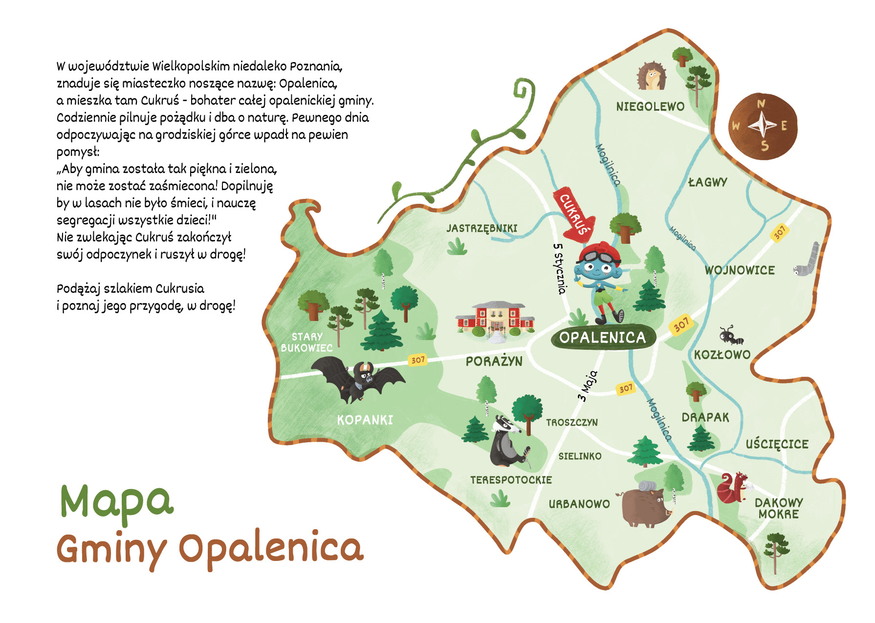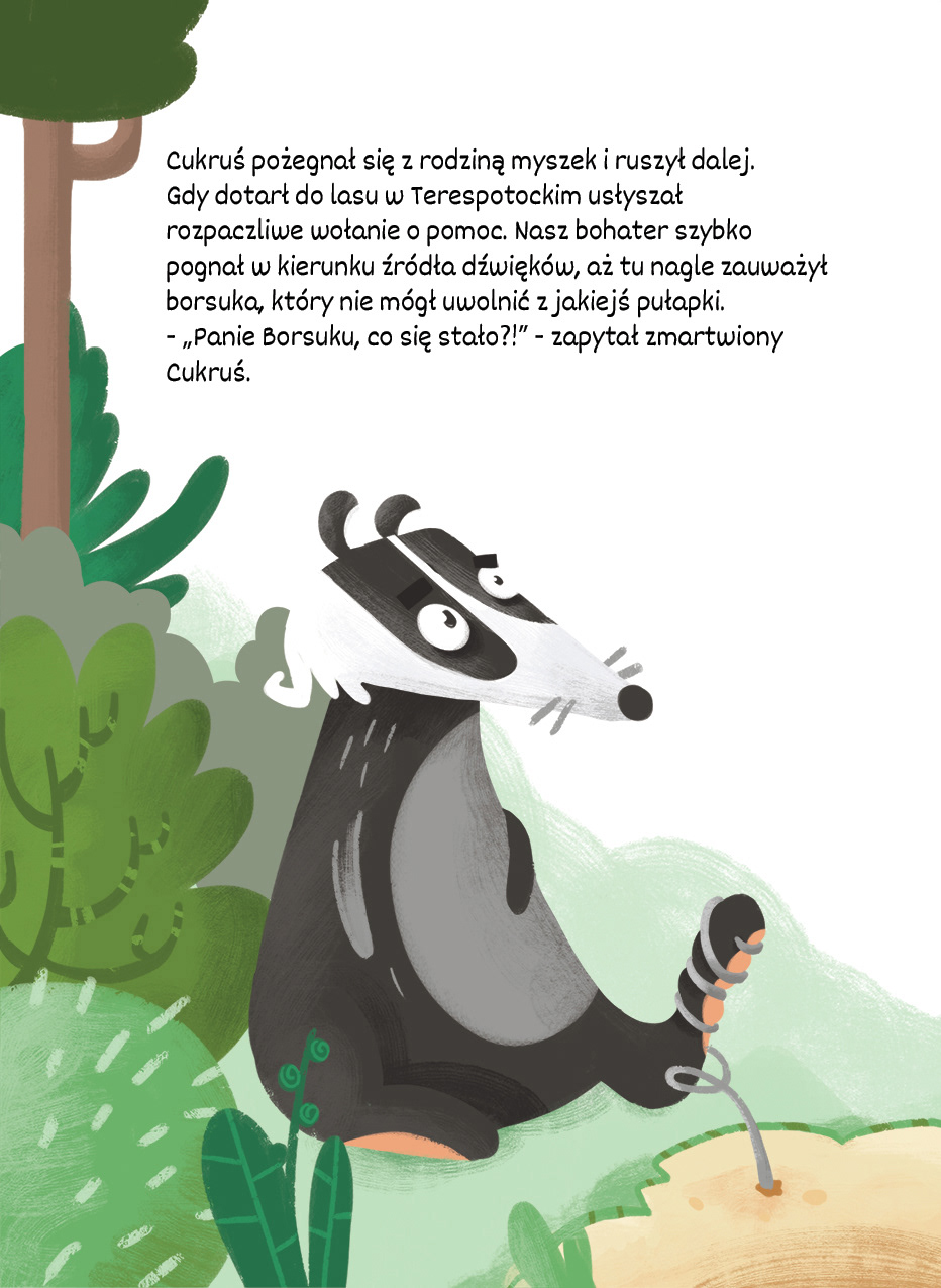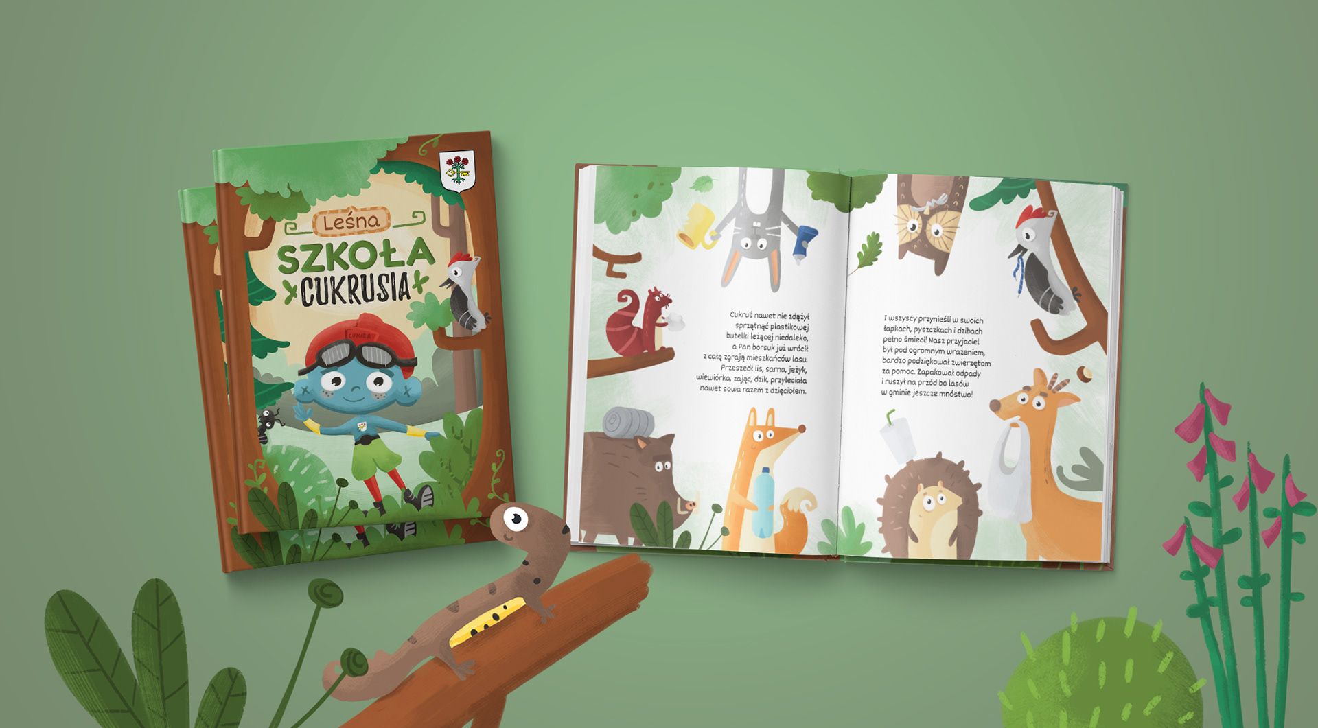 "Leśna szkoła Cukrusia" to książeczka, która uczy o lesie oraz o ekologii. Bohaterem jest Cukruś - maskotka miasta Opalenica. Projekt obejmował stworzenie tekstów oraz ilustracji.